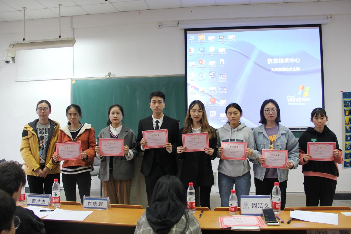 2019-2020学年学习标兵暨优良学风班评比活动在温州大学北2-402教室举行。本次评比活动由龚赵萍同学主持,出席的本次活动的评委有周洁文老师、韩新华老师以及四位商院主席团成员。