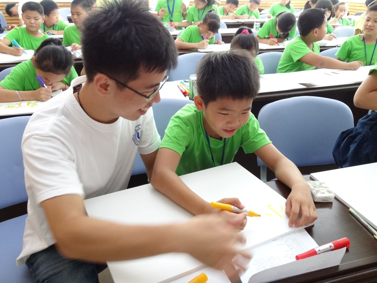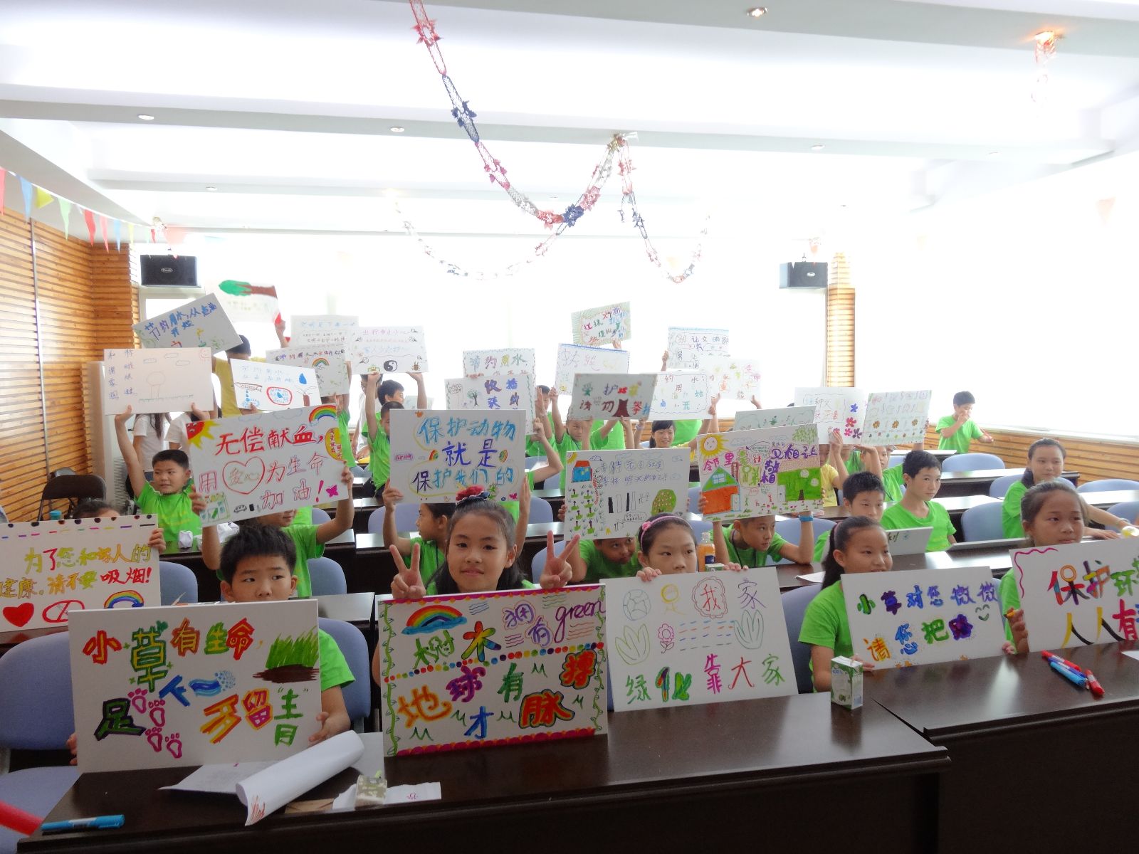上午的夏令营活动的主要内容是组织小朋友们广告牌上自由绘画,绘制内容应以每位分发到的广告标语为主题,鼓励他们充分发挥想象力,在理解广告标语含义的基础上,通过亲手绘制广告画,用另一种独特的方式向我们呈现出他们心中与之匹配的广告画。在整个绘制过程中,每位小朋友都先对自己所拿到的广告标语进行充分理解,看着他们皱眉挠头的样子,实在是可爱极了。实践队员们则是在一旁给他们“打打下手”,帮他们递画笔、调颜色。在“大作”将成之际,小朋友们还邀请队员前来欣赏,猜猜他们画的是什么。我们不得不感叹这群小朋友们超强的想象力,可见每一位小画家都很认真地完成这项任务。随后,温州电视台的主持人来到夏令营给小朋友们发了问卷,要求写下他们的梦想职业和适合自己的职业,看到小朋友们一个个若有所思的样子,我们深信他们将来都能有所作为,为社会的建设出力。