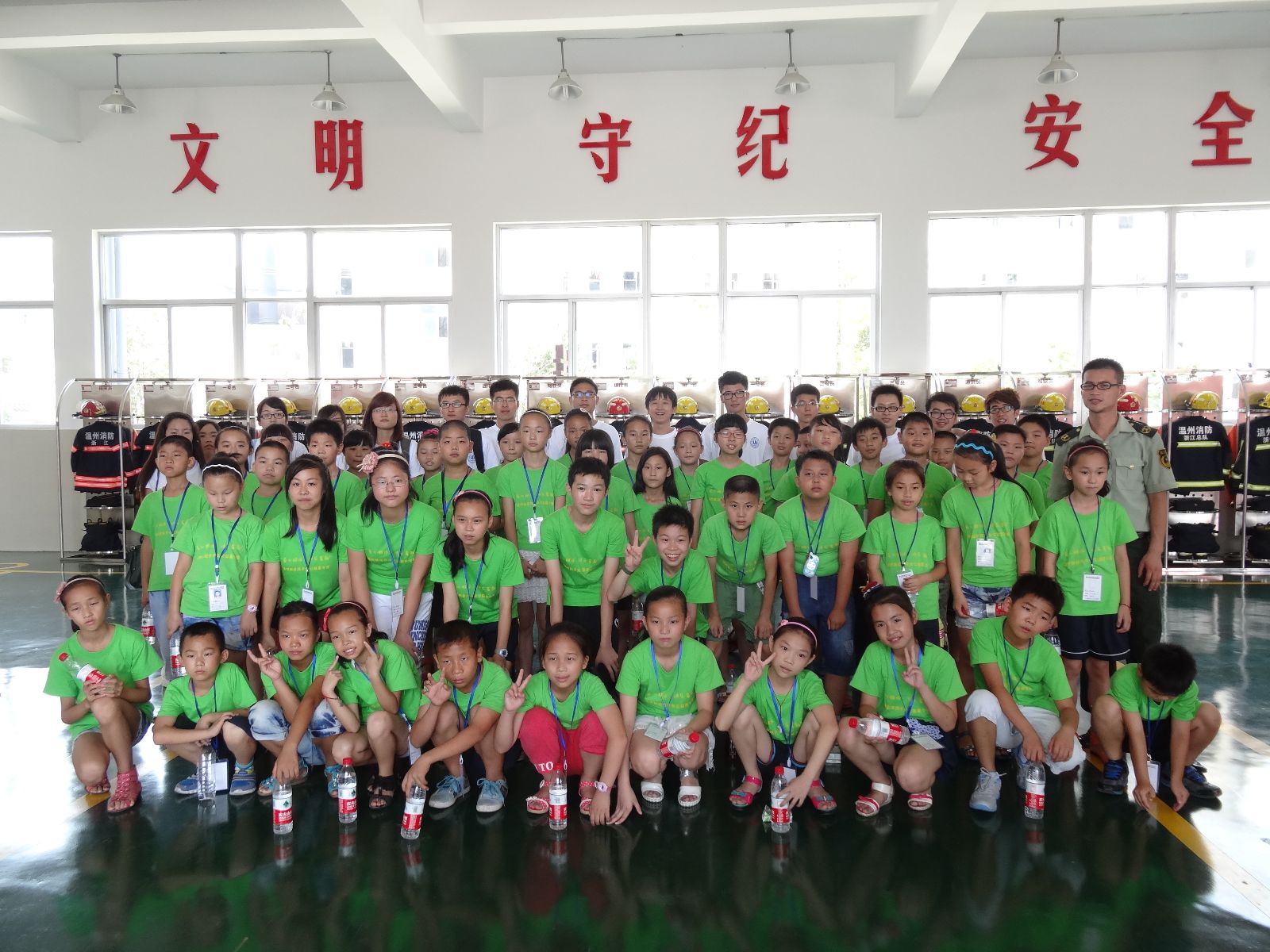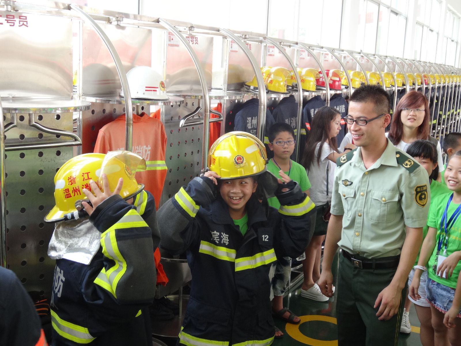 7月11日上午,实践队队员们组织小朋友们进行“以一敌五十”知识竞答。在主持人宣读了比赛规则后,大家都马上进入了状态,纷纷显露自己的聪明才智。一轮轮的问答,被淘汰的人越来越多,最后获胜的大赢家——知识达人们都得到了我们精心准备的礼品。上午10:00,实践队队员带领小朋友们去参观温州滨海区消防总队基地。在消防官兵的引导和悉心讲解下,小朋友们参观了消防装备,还试穿了消防服。小朋友们还在放映室合唱了昨天学会的歌曲——《阳光总在风雨后》,将现场气氛调动起来,赢得了全场的掌声。