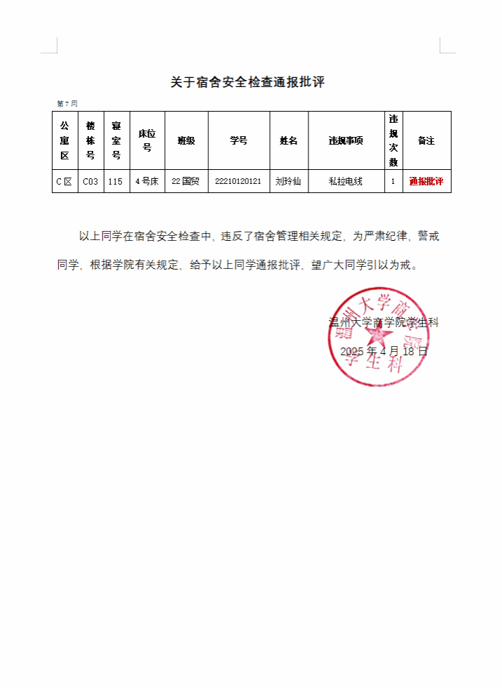 根据学校学生公寓安全“四级联查”工作机制要求,学工部、研工部、公管处、保卫部、资产公司等部门协同于4月14日对学生公寓区安全情况进行检查,我院刘玲仙同学在宿舍安全检查中,违反了宿舍管理相关规定,给予通报批评处分,通报如下: