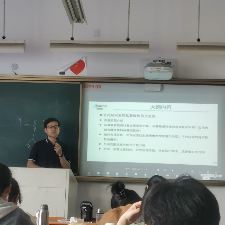李永盛老师讲课的主题是公司如何发展私募股权投资业务,从案例背景介绍、私募股权投资发展现状、细分市场分析、公司发展可行性分析等方面进行了授课,重点是把握客户需求,找到着力点方向,构建商业分析报告。此外李永盛老师还通过课堂分组,让学生分组讨论商业报告。