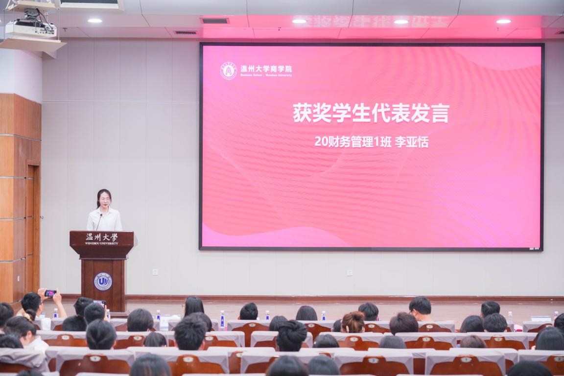 20财务1班的李亚恬作为获奖学生代表发言。她谈到,新生入学时,自己曾经参加过王仲辉校友的分享会——《中国需要一种向死而生的珠峰精神》,听过王仲辉校友勇攀珠峰的经历后,受到了极大的影响和鼓舞,在校期间以王仲辉校友为榜样不断挑战自我,努力成为了一名优秀的学生干部,并做到了德智体全面发展。发言的最后她再次感谢了上海叁陆伍集团和王仲辉校友,并表示将继续努力学习,完善自我,在将来为母校的建设献出自己的一份力量。