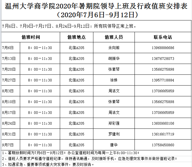 银河赌场-澳门银河赌场官网 2019-2020学年暑期值班安排表(2020年7月6日-9月12日)
