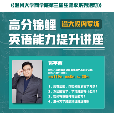 据悉,本次讲座还向在座各位同学传达2021-2022学年第一学期资助约50名学生进行雅思专项学习的利好消息,并且分享了《温州大学外语考试奖学金暂行管理办法》相关文件,对于参加温州大学认定的外语考试且成绩达到要求者给予2000-2500元不等的奖学金。希望同学们积极参与雅思专项学习项目的选拔,享受温州大学为学生们设立的各项优惠措施,提升自己的综合竞争实力,进入理想的海外大学深造。