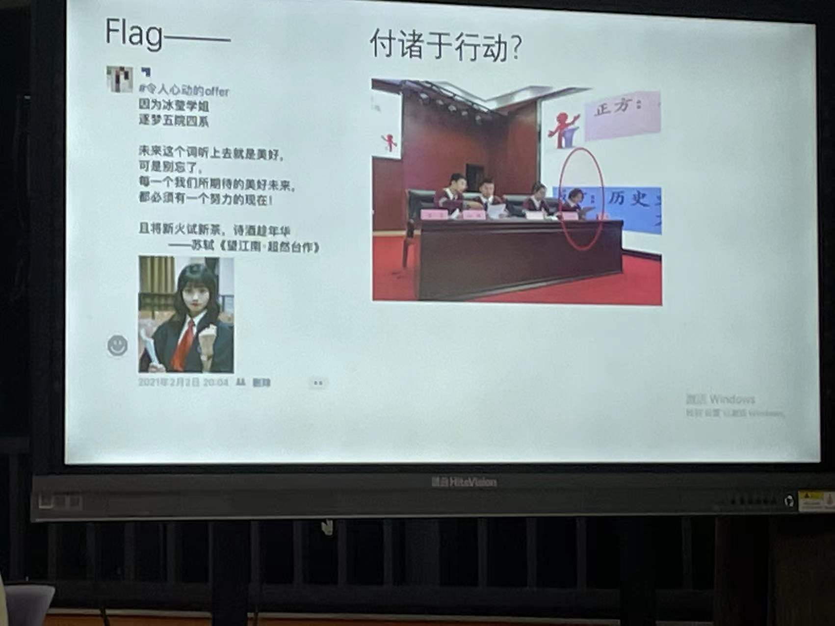 八(31)班的方同学希望自己能成为拥有极强思辨性,说话做事坚决果断的人。“为了梦想,我选择良性内卷。”梦想成为一名律师的她,为此在朋友圈立flag并付诸于行动。双减政策下她有了更多发现自我潜能的机会,积极参与五小文化节语文学科辩论赛、撰写文学社《载阳》刊物编辑语,为律师梦特意磨砺自己背诵记忆的能力……以努力的现在为期待的未来作准备。