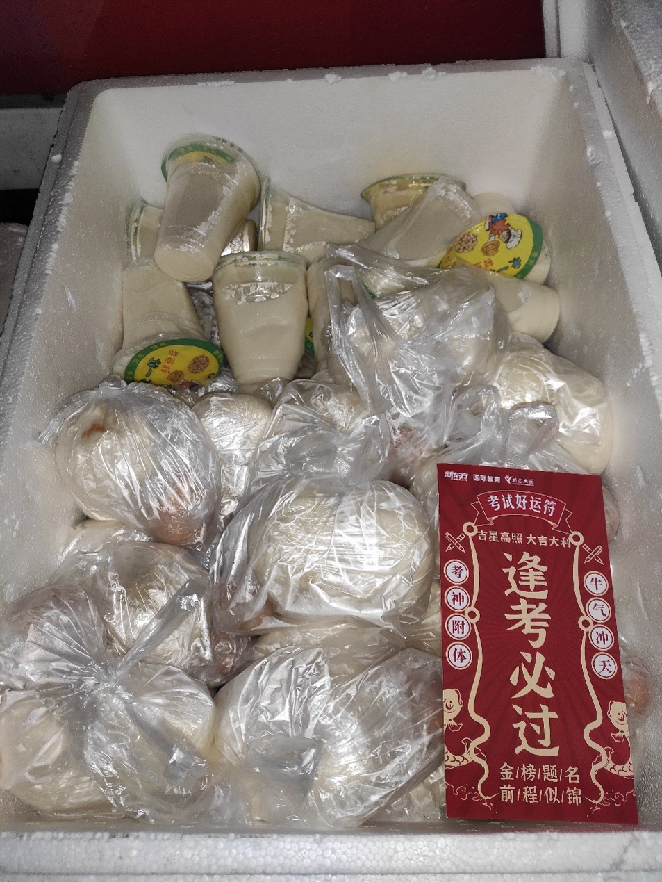 党委副书记唐华、毕业班辅导员黄汉和送考服务的志愿者们早早地来到现场,为考研学子加油助力。