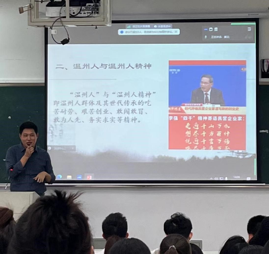 其次,冀晋才博士为同学们描述了温州发展历程和温州文化的繁荣发展。始于秦朝,盛于宋代,发展于近代。这期间,学术,文学艺术等方面都取得卓越成就。冀晋才博士详细为同学们介绍了“永嘉学派”创始人—叶适,明朝开国元勋—刘基以及当代文化教育界的群星璀璨。然后冀晋才博士的思绪来到红色革命时期,讲述了红十三军,英雄粟裕,英雄刘英的红色故事,带同学们聆听了那段峥嵘岁月。之后冀晋才博士讲解了温州在改革开放期间的飞速发展的原因。乘着改革开放的春风,温州人借势商机,以“敢为天下先,特别能创业”的精神,决胜四海。温州作为改革开放先行地,更是发生着翻天覆地的变化。