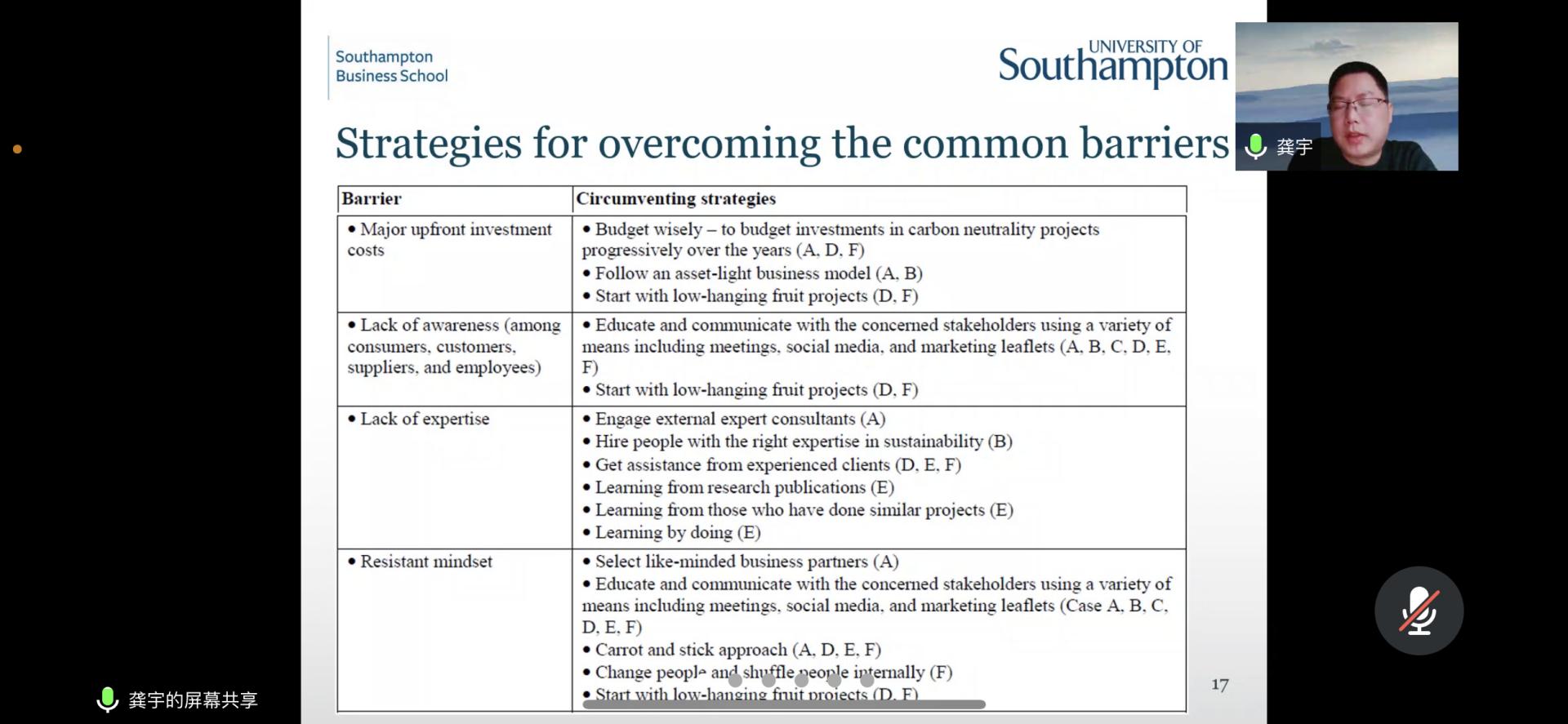 邀请到了英国南安普顿大学的龚宇副教授进行了一场讲座,讲座的主题为从案例分析的角度如何克服供应链去碳化过程的障碍。