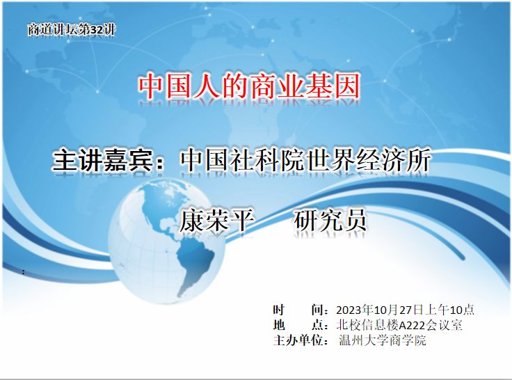 会上,康荣平研究员对中国人的商业基因进行了分析,他认为,历史上中国的市场经济,与西方的海洋型相比,属于内陆型市场经济;三千多年同一族群的内陆型商业实践及传承,铸成了中国人的商业基因;在人类历史上是连续实践时间最长、人口数量最多,今天中国经济高速发展的背后,中国人的商业基因是最重要因素之一。
