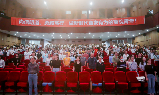 的老师们一定会给每一位学生带来一场场丰富的思想盛宴,相信大家可以在这里取得巨大成功。随后,20级研究生新生代表陈实和本科生代表颜笑晨先后上台发言。他们表示,求学问是,求的是学问,问的是真理和良知;敢为人先,敢的是破旧和立新,为的是创新和成就。作为商院学子,他们满怀向往和憧憬,在追梦的途中将会一路披荆斩棘,直至理想彼岸。