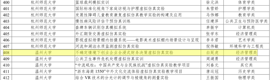近期浙江省教育厅发文,我院白延虎、程仲鸣、张烨、金必简、潘晶晶等老师申报的《不确定情境下创业企业全浸式财务决策虚拟仿真实验》获得立项。