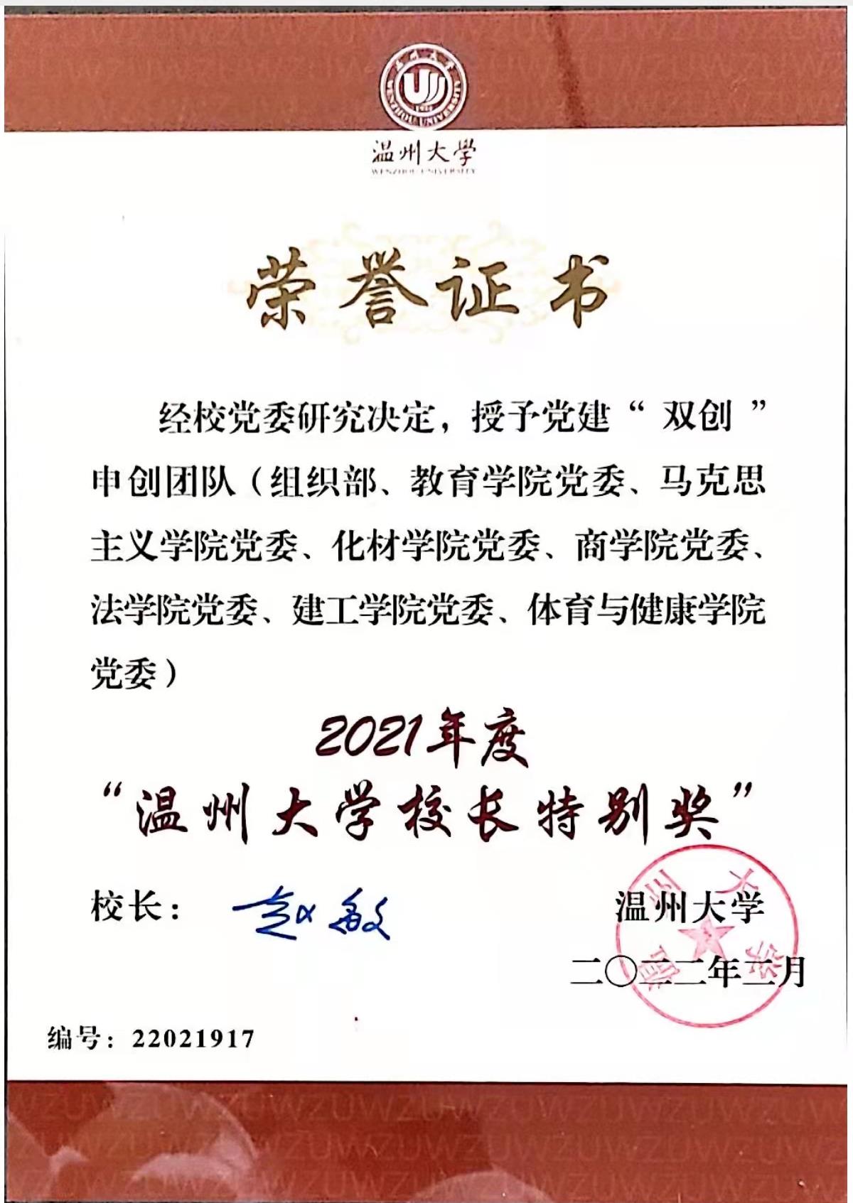 【喜报】银河赌场 党委喜获2021年度“温州大学校长特别奖”