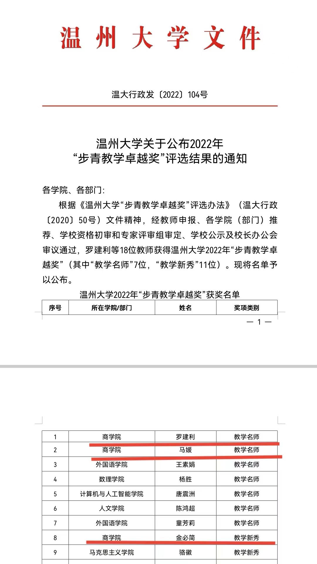 我院罗建利,马媛两位老师获得2022年“步青教学卓越奖”教学名师,金必简老师获得2022年“步青教学卓越奖”教学新秀。