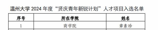 热烈祝贺商银河赌场 章素珍老师获评2024年度温州大学“贤庆青年新锐计划”人才!