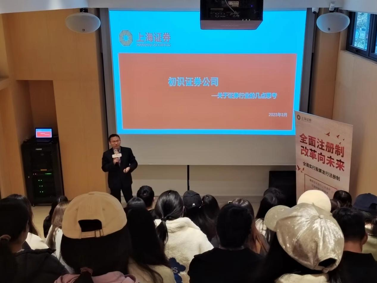 参观结束后,上海证券温州分公司金良镇老师为成员们作“初识证券公司——关于证券行业的几点思考”专题讲座。金老师从以“证券公司是做什么的、需要哪方面的人才”为切入点向成员们介绍证券行业;并详细讲解了股票的上市条件、债券公司的工作内容和要求;还向成员们分享了从事证券行业所需要具备的能力和素养,为计划从事证券行业的同学指明了努力的方向。