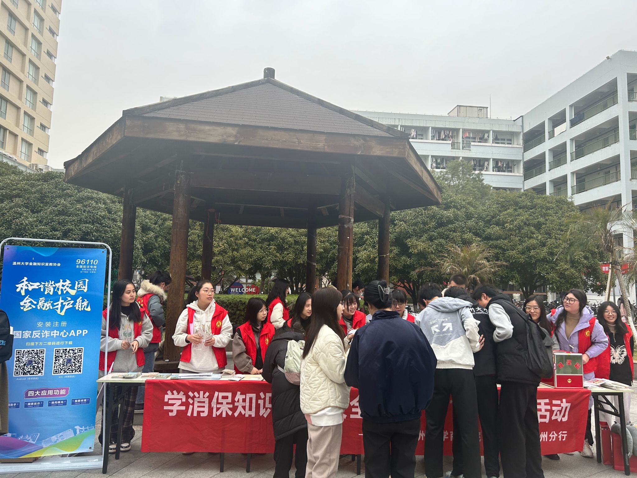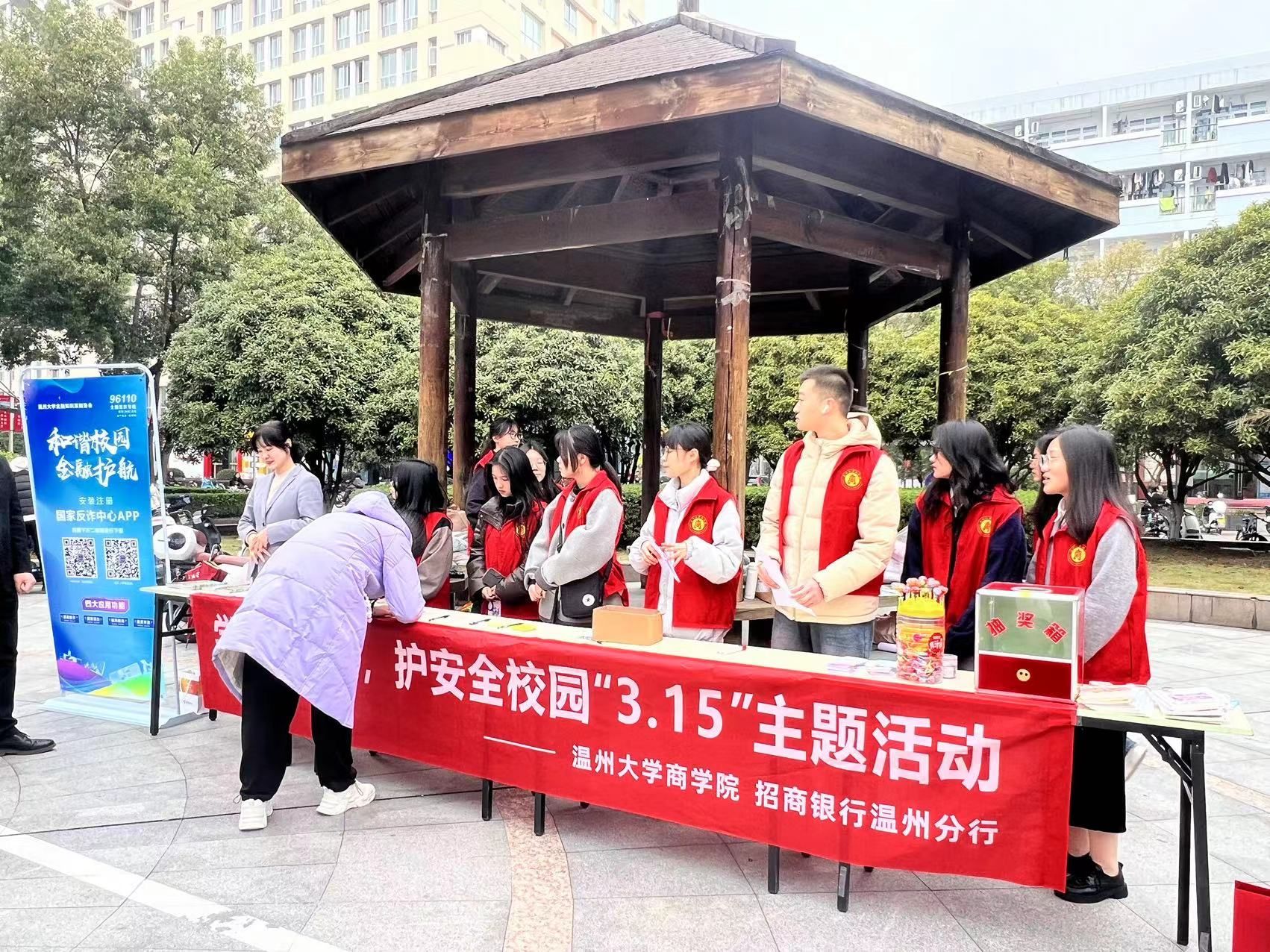 “当同学们遇到消费者权益被侵犯时,请拨打电话12315进行合理维权……”,协会联合招商银行温州分行开展一场“学消保知识,护安全校园”主题宣传活动。活动现场,协会成员与银行工作人员采取悬挂宣传标语、发放宣传手册等多种形式向同学们普及“国际消费者权益日”的发展历史与意义。此外,协会还特意围绕《消费者权益保护法》等法律法规知识开展了有奖竞答活动。银行工作人员现场为学生详细解读宣传折页,并结合学生日常生活遇到的问题予以一一解答。