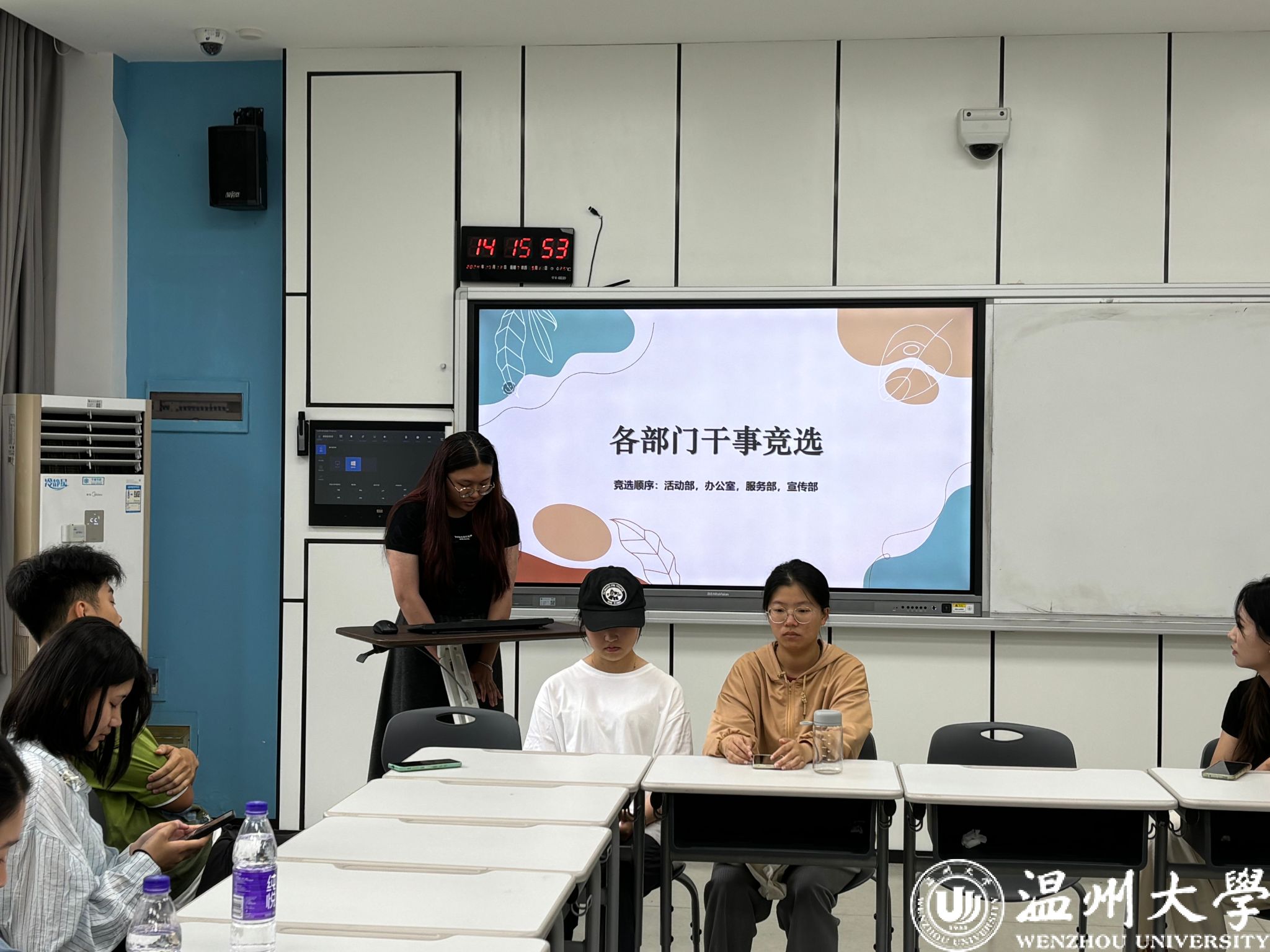 紧接着,各部门干事竞选。活动部部长孙诚阳、办公室部长沈依恬、服务部部长刘武年、宣传部部长金姝伶详细介绍各部门职责后,会员们纷纷上台进行竞选陈述,勇敢地展示自己的才华和热情。会员们分享了自己对社团工作的憧憬、对金融知识的热爱,阐述了现在所具备的优势和能力。