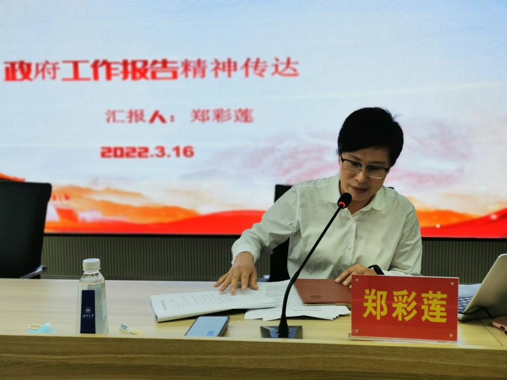 郑彩莲书记传达贯彻全国两会精神。她介绍了今年两会的重要背景、重要意义、重要议程。郑彩莲书记指出2022年全国两会的胜利召开具有非凡意义,习近平总书记在全国两会期间发表了重要讲话,提出了一系列新理念、新要求、新任务,同时今年两会对教育领域十分关注,对高等教育提出了更高的要求。她强调,一,要提高政治站位,老师们要学深学透全国两会精神。二,结合学校银河赌场
