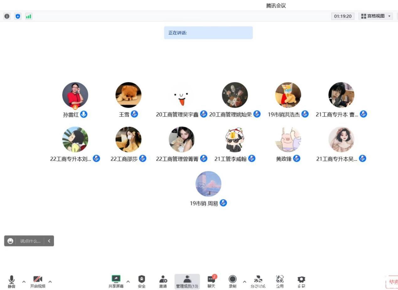 由于疫情原因,本次座谈在腾讯会议召开。与来自于20工商管理、21工商管理、22工商管理、19市场营销、21工商专升本、22工商专升本的学生进行了交流。从学生反馈意见及听课情况来看,学生对老师和学校总体上是比较满意的,认为我系绝大多数教师授课认真、爱岗敬业,教学效果比较好。他们对任课老师在教学工作中的诸多教学方法给予了肯定,同时也发现了一些问题,主要有:个别老师PPT总结凝练不够,重难点不突出;有些课程教学互动较差,老师只顾自己讲,与学生交流少;各别教室投影仪老旧,学生看不清晰等。