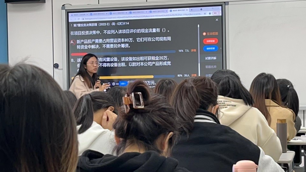 在课堂上金老师运用智慧教室的智能化开展课堂教学。首先,学生需要通过扫描二维码进入课堂,随着课堂的进展利用手机完成金老师精心设计线上互动答题。其次,在课堂中,金老师开展引入案例的教学,巧妙地激发了学生对实际业务问题的思考,从而锻炼学生的发散思维。高效、高能、互动的新型课堂教学,使学生完全浸润在高端信息技术所营造的浓郁学习环境中,由此提高学习的积极性和效率。