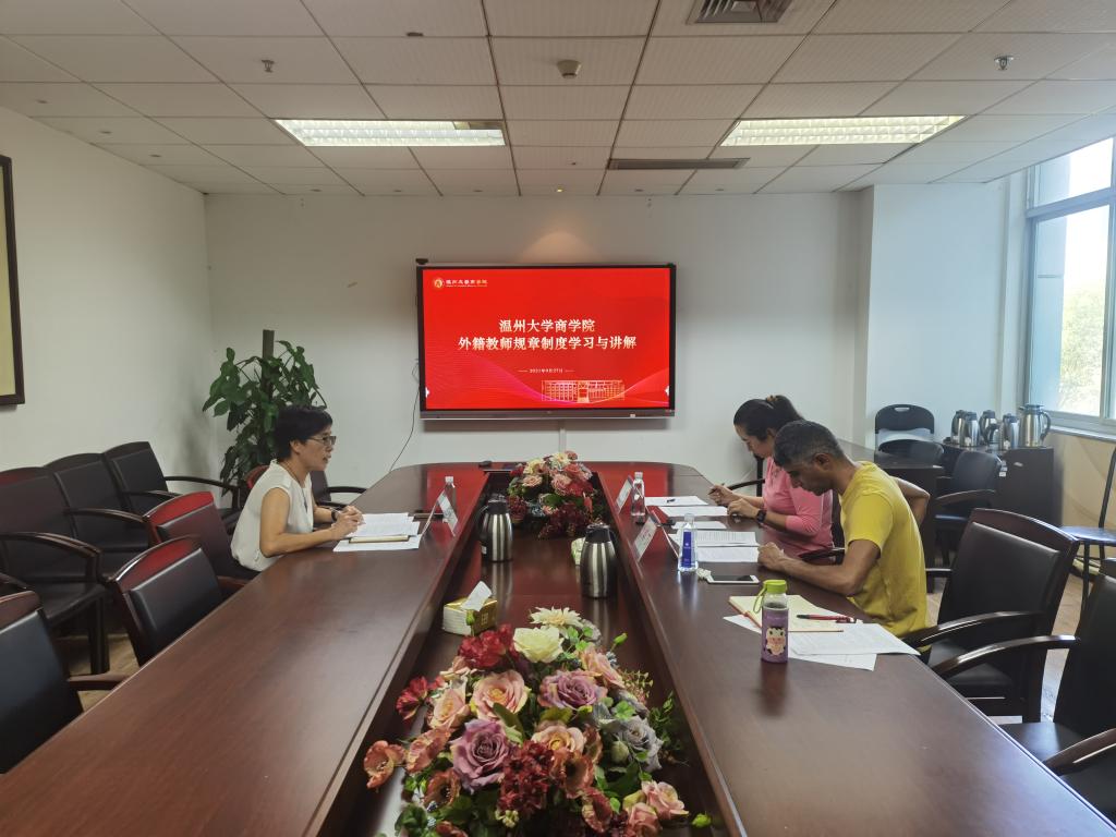 会上,郑彩莲书记就《外籍教师聘任合同》和《外国人在中国就业管理规定》相关条例作了详细解读,对两位外教在中国的生活和工作做了全面了解,希望二位外籍老师遵守中国的法律和温州大学的校规,在温大认真工作,愉快生活。之后两位老师和郑书记交流了自己目前在温大工作的一些心得体会。