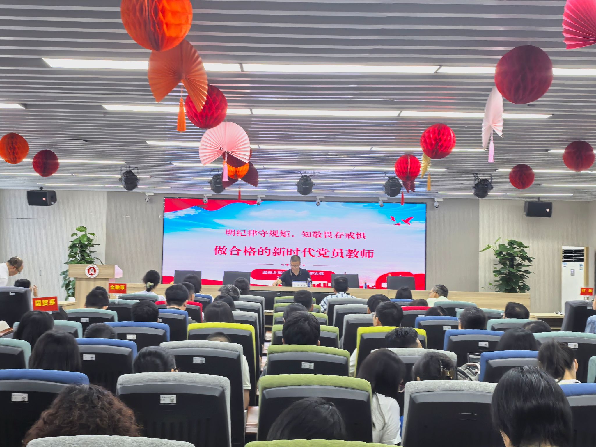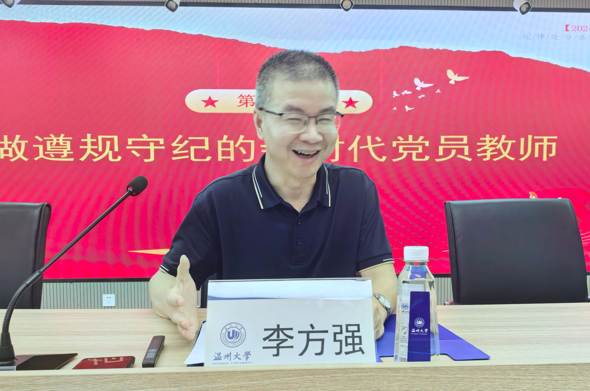 李方强书记以《明纪律守规矩,知敬畏存戒惧,做合格的新时代党员教师》为题,从深刻认识纪律严明的重要性、《条例》主要内容学习、做遵规守纪的新时代党员教师三方面讲述,从党的历史发展来看纪律严明是党的光荣传统和独特优势,从党面临的问题来看纪律严明是全面从严治党的现实需要,新时代伟大事业对党提出了更高要求,加强纪律建设是解决大党建设独有难题、不断推进党的自我革命的题中之义,他从政治纪律、组织纪律、廉洁纪律、群众纪律、工作纪律、生活纪律等党的六项纪律和四种处罚形态入手讲解条例的主要内容,六种纪律都例举了高校实际发生的负面典型案例,以案示警、以案明纪,他指出大家要自觉提升纪律修养,锤炼忠诚干净担当的政治品格,加强自我约束,勿存侥幸心理,勿因小失大,他希望大家都能做一个遵规守纪的新时代党员教师。